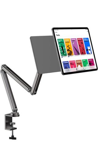 Supporto pieghevole magnetico per iPad. - Design in metallo grigio. - Braccio articolato per posizionamento flessibile. - Base a morsetto per fissaggio sicuro.