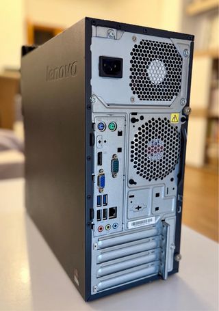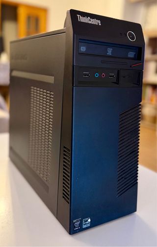 Computer desktop Lenovo ThinkCentre in colore nero. - Processore Intel Core i3-4130. - Memoria RAM 8GB. - Disco rigido SSD 250GB. - Windows 11 Pro. - Pacchetto Office 2024 Professional. - Design verticale. - Frontale con griglia. - Porte USB e audio frontali. - Unità DVD writer.