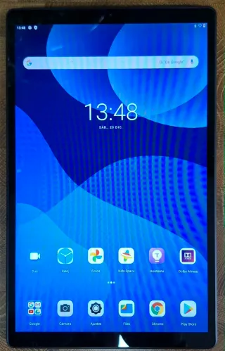 Tablet Lenovo in buone condizioni, con schermo da 10 pollici. Colore nero e blu. Include applicazioni come Google, Chrome, Fotocamera, Impostazioni, File, Duo, Orologio, Foto, Kids Space, Assistente e Dolby Atmos. Fotocamera frontale da 5 MP e posteriore da 8 MP.