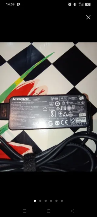Adattatore di corrente Lenovo. Modello: 150324-12. Certificazione Safety Mark. Conforme a IS 13252 Parte 1 IEC 60950-1. Prodotto in Cina.