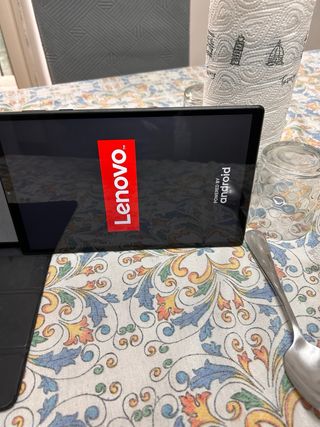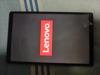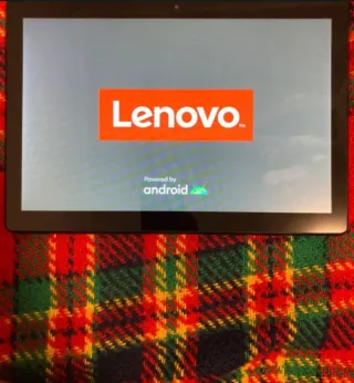 Tablet Lenovo con sistema operativo Android. Ha un piccolo danno. - Schermo con logo Lenovo. - Indicatore 'Powered by Android'.