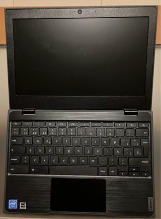 Portatile Lenovo con finitura nero e grigio. Design moderno e compatto. - Schermo da 11 pollici. - Tastiera QWERTY spagnola. - Processore Intel. - Design leggero e portatile.