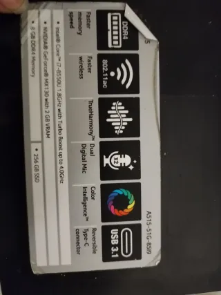Notebook Acer Aspire 5 in nero. - Processore Intel® Core™ i7-8550U 1.8GHz con Turbo Boost fino a 4.0GHz - Scheda grafica NVIDIA® GeForce® MX130 con 2 GB VRAM - 8 GB di memoria DDR4 - 256 GB SSD - Wi-Fi 802.11ac - TrueHarmony™ Dual Digital Mic - Porta USB 3.1 Type-C reversibile -Schermo 17" Batteria in ottime condizioni, circa 85% di capacità originale. Sistema operativo Windows. Perfettamente funzionante. Vendo per inutilizzo