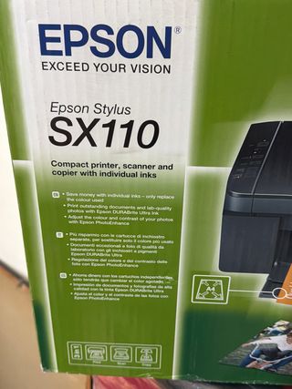 Stampante multifunzione Epson Stylus SX110, compatta e pratica. - Funzioni di stampa, scansione e copia. - Utilizza cartucce d'inchiostro individuali. - Ideale per documenti e foto di qualità. - Permette di regolare colore e contrasto delle foto.