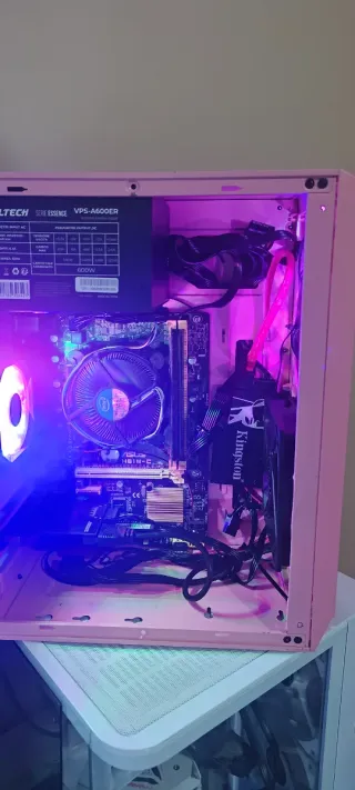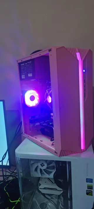 Computer fisso con processore i5 e 12GB di RAM. La scocca esterna è di colore rosa, mentre alcuni componenti interni e le ventole sono bianchi. - Processore Intel i5 - 12GB di RAM - Case esterno rosa - 512 GB SSD
