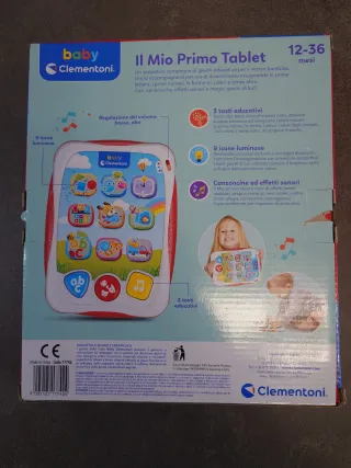 Tablet educativa parlante Baby Clementoni per bambini dai 12 ai 36 mesi. Insegna lettere, numeri, forme, colori e versi degli animali. - 9 icone luminose. - 3 tasti educativi. - Include tante canzoncine e filastrocche. Usato solo per probare se funziona. Include le batterie.