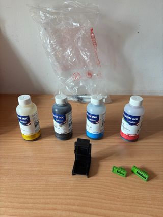 Kit per la ricarica di cartucce d'inchiostro. - Include inchiostro giallo, nero, ciano e magenta. - Vengono fornite anche siringhe e accessori per il riempimento e strumento per lo spurgo