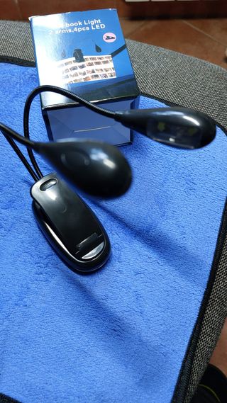 Lampada LED portatile per la lettura, ideale per libri. - Due bracci flessibili. - Quattro LED per un'illuminazione chiara. - Design compatto e leggero. - Alimentazione a batteria (non inclusa). - Certificazione CE.