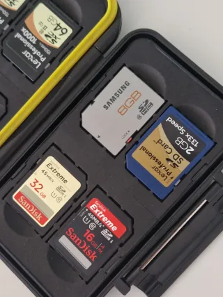 Vendo lotto di schede SD e lettore di schede. - 4 schede Lexar Professional 64GB 1000x - 1 scheda Samsung 8GB - 1 scheda Lexar Professional 2GB 133x Speed - 2 schede SanDisk Extreme 32GB e 16GB - 1 lettore schede Kingston