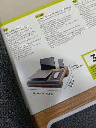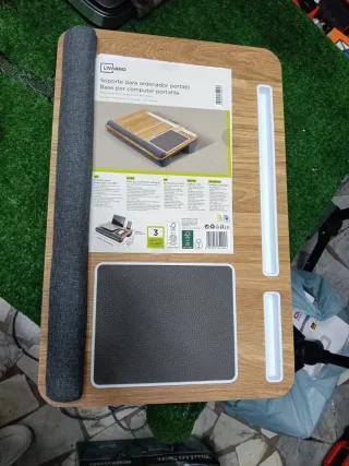 Tavolo d'appoggio in legno con cuscino per un maggiore comfort. Ideale per usare il laptop o tablet. - Superficie in legno con finitura naturale. - Cuscino grigio integrato per il polso. - Bordi rialzati bianchi.
