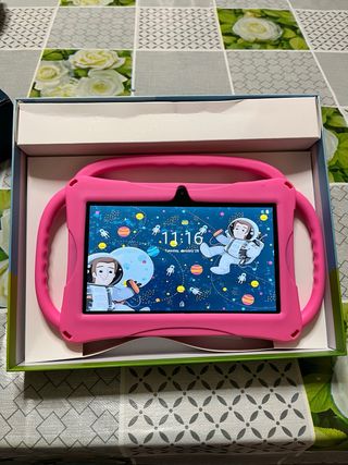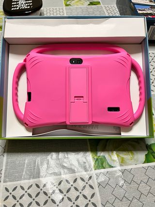 Tablet per bambini con una custodia protettiva rosa. Statistiche 4gb di ram 32 di rom 7 pollici e cavo di ricarica usb-C - Custodia con manici integrati per un facile trasporto. - Design colorato e adatto ai più piccoli.