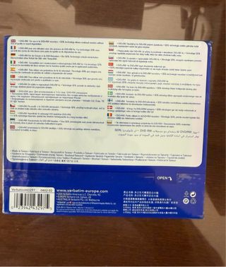 Confezione da 5 dischi DVD+RW Verbatim. - Capacità: 4.7 GB - Velocità di scrittura: 4x - Tempo di registrazione: 120 min - Colore: Colour/Couleur mai usati