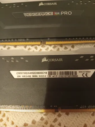Kit di due moduli di memoria RAM DDR4 Corsair.Modello: CMW16GX4M2D3600C18 - Capacità totale: 16GB (2x8GB) - Frequenza: 3600MHz - Latenza: CL18-22-22-42 - Voltaggio: 1.35V si illuminazione RGB personalizzate bellissime purtroppo non trovo più la scatola