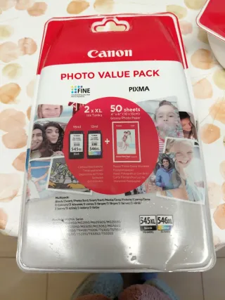 Pacchetto foto Canon che include due cartucce d'inchiostro XL e 50 fogli di carta fotografica brillante. - 2 cartucce d'inchiostro XL (PG-545XL nero e CL-546XL color). - 50 fogli di carta fotografica brillante da 10x15 cm (4x6). Ne restano due!