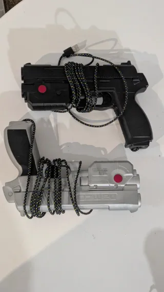 Due pistole GUN4IR per PC, una in nero e l'altra in argento, modelli Guncon. Ideali per giocare su PC con televisori moderni. Includono vibrazione e rinculo (la corredata non è mobile). Includono due pedali e la barra LED. Compatibili con PC, Raspberry, Pandora Box, Macchina Arcade, TV Box. Compatibili con tutti i tipi di televisori, sia vecchi che moderni: tubo (CRT), plasma, LCD, LED, MicroLED e OLED. Entrambe le pistole hanno vibrazione e funzione di rinculo (retrocessione quando si preme il grilletto). Includono: pulsante START, pulsante SELECT, Joystick con croce, 3 pulsanti, compatibili con tutti i tipi di giochi con pistola.
