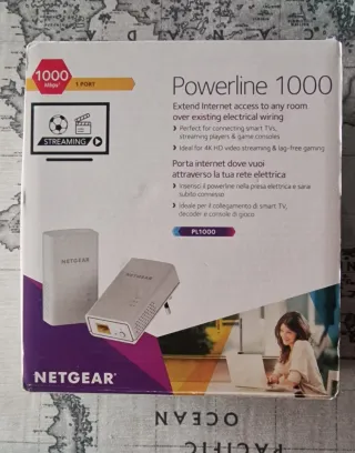 Adattatore Powerline 1000 di NETGEAR per estendere la tua connessione internet tramite la rete elettrica. Ideale per Smart TV, console di gioco e lettori streaming. Supporta streaming video 4K HD e giochi senza lag. Include 1 porta Ethernet.