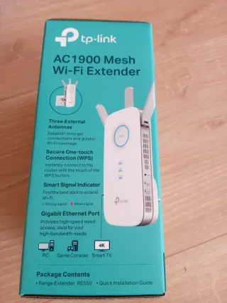 Estensore WiFi Mesh AC1900 TP-Link RE550. Progettato per migliorare la copertura della tua rete wireless. Tre antenne esterne per connessioni più forti. Connessione WPS sicura con un solo tocco. Indicatore di segnale intelligente per trovare la posizione migliore. Porta Ethernet Gigabit per accesso cablato ad alta velocità. Compatibile con PC, console di gioco e Smart TV 4K. Include l'estensore RE550 e una guida rapida all'installazione. Prezzo nuovo circa 65 Euro.