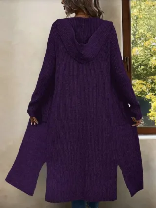 Cardigan lungo in maglia color viola, con cappuccio e spacchi laterali. - Tessuto a coste. - Design aperto sul davanti. - Lunghezza midi.