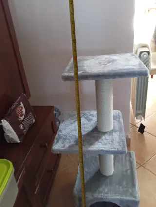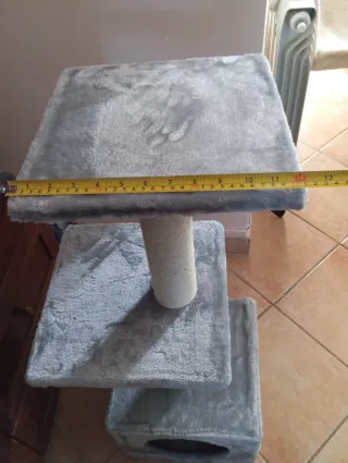 Tiragraffi a più livelli per gatti, realizzato in morbido pile. - Struttura a più piani. - Rivestimento in pile grigio.
