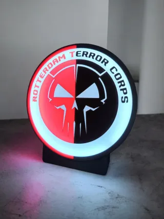 Lampada a tema Hardcore Rotterdam Terror Corps, perfetta per gli appassionati del genere Gabber. Il design presenta una divisione cromatica tra rosso e nero. - Design a tema Rotterdam Terror Corps. - Combinazione di colori rosso e nero. - Elemento decorativo per gli amanti della musica Hardcore. Misure logo 20x20x5 cm, misura base 5x4 cm