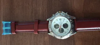Orologio da polso Bulova con cinturino in pelle marrone e cassa in metallo argentato. - Quadrante bianco con dettagli neri e rossi. - Funzione cronografo. - Resistente all'acqua 3 ATM. Orologio Bulova originale anno 1984 perfettamente funzionante, cronometro con lancette decimi e centesimi, calendario.Ghiera con settori da 60 a zero rotante, cinturino nuovo con chiusura ad ardiglione, batteria nuova .
