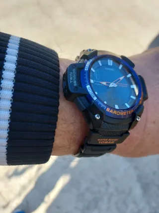 Orologio Casio SGW-450H con doppia funzione sensore. - Funzione altimetro. - Funzione barometro. - Resistente all'acqua fino a 10 BAR. - Display digitale con indicazione del giorno della settimana. - Il colore blu cobalto della corona con i pulsanti arancio su fondo nero, gli dona eleganza e sportività