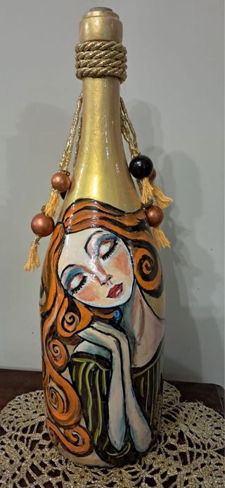 Bottiglia unica decorata a mano con un'affascinante figura femminile. - Decorazione artistica su vetro. - Dettagli dipinti con cura. - Finitura dorata sul collo della bottiglia. - Corda dorata e nappe decorative. - Altezza:45cm