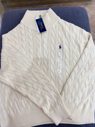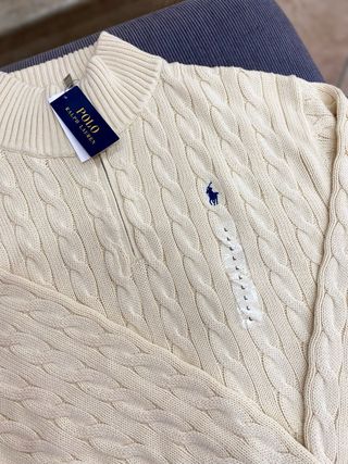 Elegante maglione con trama a trecce e zip. Nuovo ancora con etichetta, in 100%lana. Prezzo svendita prezzo originale 215€ Si accettano offerte. Per qualsiasi domanda sulle misure chiedere risposta immediata e spedizione max24h - Collo alto con zip. - Logo del cavallino ricamato sul petto. - Polsini e fondo a costine.