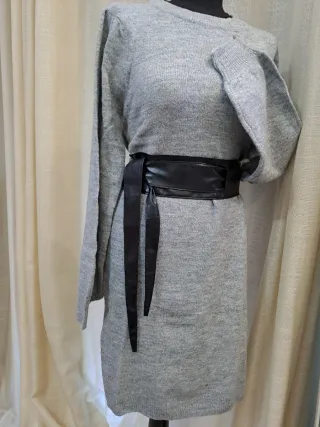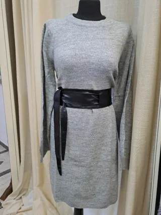 Abitino in lana grigio, taglia L, nuovo con cartellino. - Tessuto morbido e caldo. - Design a manica lunga a sbuffo con polsino - Cintura in ecopelle nera inclusa.