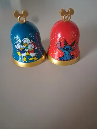 Set di 2 campanelle a tema Disney, perfette per le decorazioni natalizie. - Campanella blu con Paperino e amici. - Campanella rossa con Stitch. - Dettagli dorati e Mickey Mouse in cima.