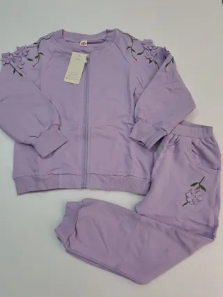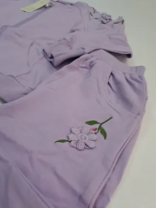 Completo due pezzi per bambina in morbido tessuto lilla, perfetto per il tempo libero. - Felpa con zip e applicazioni floreali sulle spalle. - Pantaloni con elastico in vita e caviglie. - Dettagli floreali ricamati sui pantaloni.