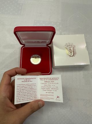 Moneta commemorativa da 2€ del Principato di Monaco, Millésime 2025, dedicata al Marchesato dei Baux. - Composizione: Cu Zn Ni et Cu Ni - Massa: 8.5 g - Diametro: 25.75 mm - Qualità: Belle Épreuve - Frappe/Mintage: 15.000 - Numero di serie: N° 07710 Articolo NUOVO, sigillato e 100% ORIGINALE con fattura d’acquisto disponibile per garantire l’autenticità. Perfetta per collezionisti attenti o per chi cerca un pezzo raro e prestigioso. Spedisco in modo EXPRESS entro poche ore dall’acquisto (massimo il giorno dopo 🚀) con imballaggio sicuro e tracciabile. Leggi le mie recensioni 🌟: acquirenti sempre soddisfatti per serietà e veloci