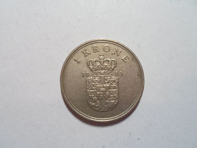 Moneta da 1 corona danese coniata nel 1965. Raffigura lo stemma reale danese e una corona. - Anno: 1965 - Valore: 1 Corona - Paese: Danimarca