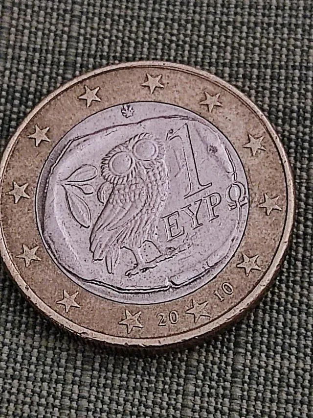 Moneta da 1 Euro della Grecia, coniata nel 2010. - Raffigura la civetta, simbolo di Atena. - Anno di conio: 2010. - Paese: Grecia.