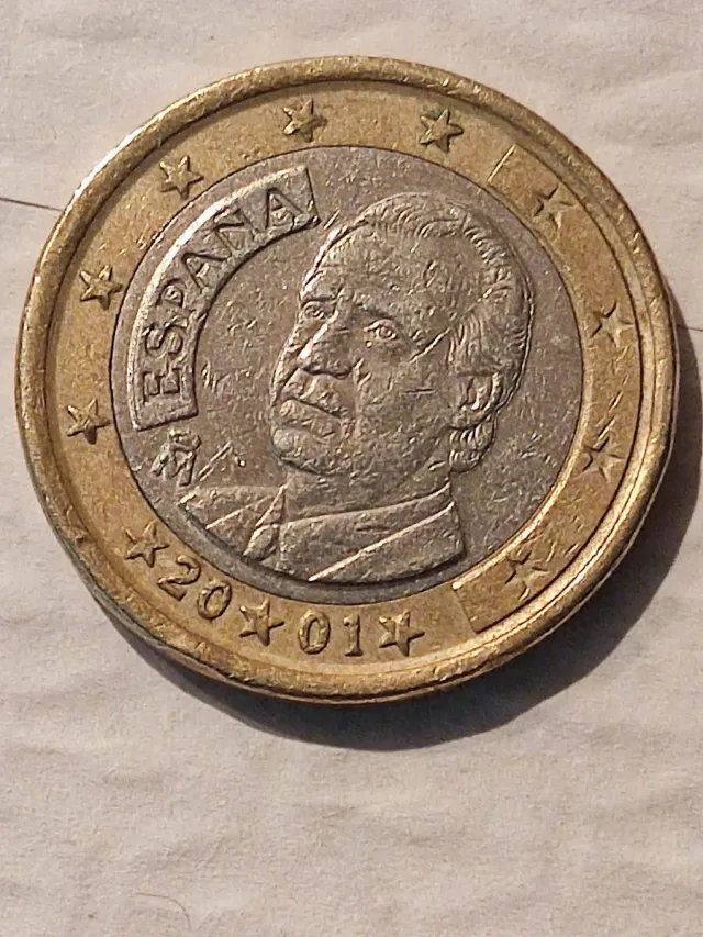 Moneta da 1 Euro della Spagna, coniata nel 2001. - Dritto: Ritratto di Re Juan Carlos I. - Rovescio: Mappa dell'Europa con le stelle. - Anno di coniazione: 2001.