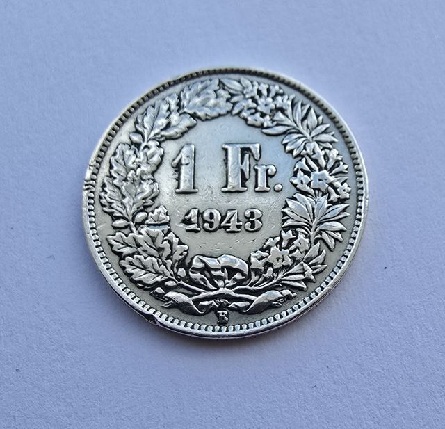 Dettagli del prodotto1 Franco della Confederazione Helvetica (Svizzera) in argento 0.835 coniato a Berna nel 1943, del diametro di 23.2 mm e disegnato da Antoine Bovy (A.BOVY INCT.), Albert Walch.