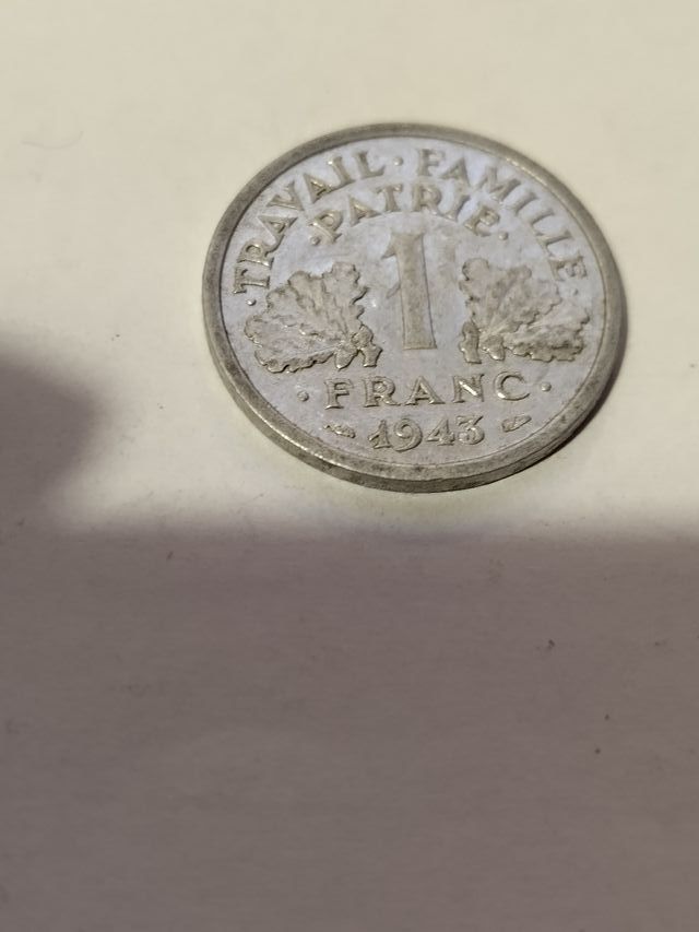 Moneta da 1 Franco Francese del 1943. - Dritto: TRAVAIL PATRIE FAMILLE con due rami di quercia. - Rovescio: 1 FRANC e 1943 con un ramo di quercia.