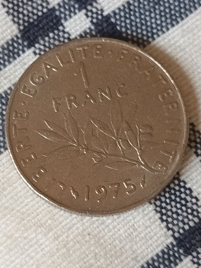 Moneta da 1 Franco Francese del 1975. - Dritto: REPUBLIQUE FRANCAISE con Marianne e un ramo di alloro. - Rovescio: 1 FRANC con un ramo di olivo e l'anno 1975.