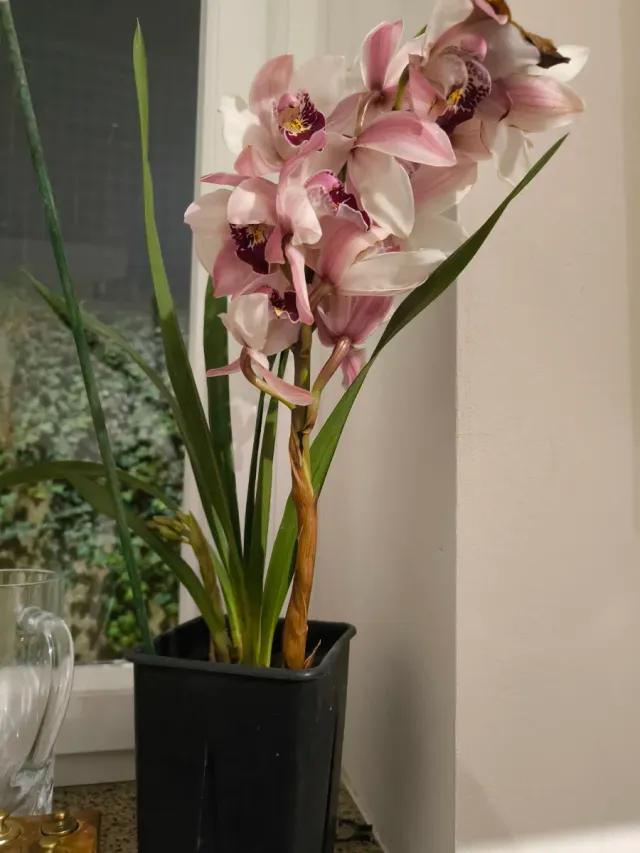 Dettagli del prodotto1 Bellissima pianta di orchidea Cymbidium con fiori rosa e bianchi come in foto con vaso . Ideale per decorare la casa.