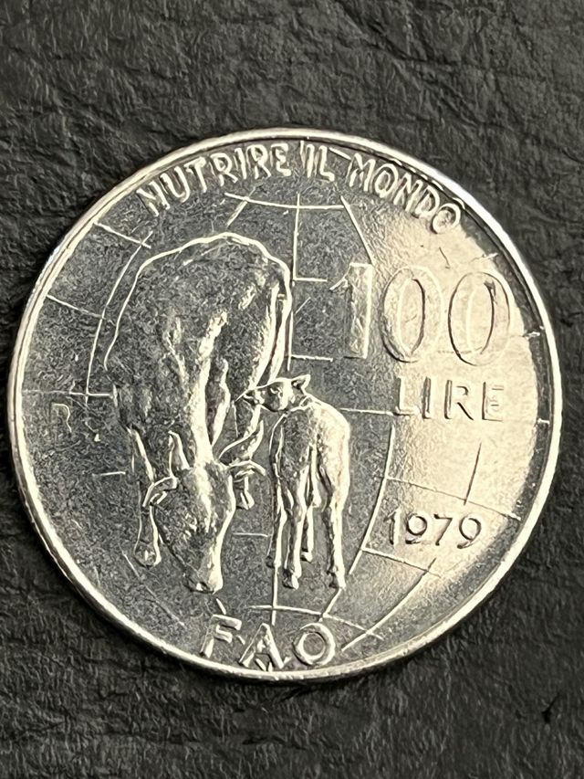 Dettagli del prodottoMoneta commemorativa da 100 Lire del 1979, dedicata al tema Nutrire il Mondo dall'Organizzazione delle Nazioni Unite per l'Alimentazione e l'Agricoltura (FAO).