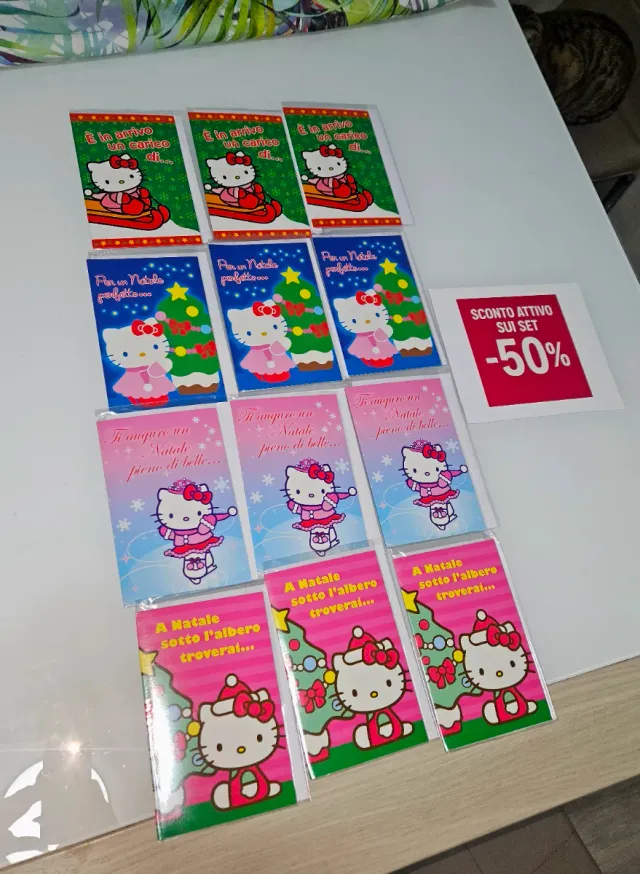 Dettagli del prodottoSet di 12 biglietti d'auguri a tema Hello Kitty, perfetti per il Natale dei più piccoli.