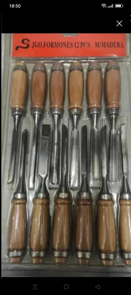 Dodici lime e scalpelli con manico in legno misurano 20 cm e alcuni sono leggermente arrugginiti.