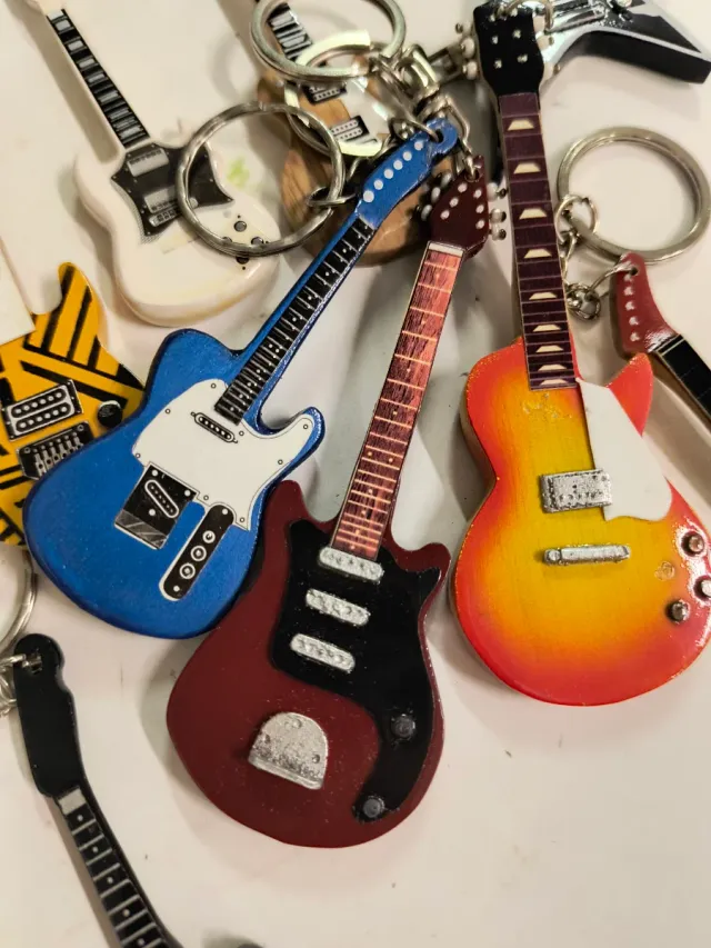 Dettagli del prodottoSet di 13 portachiavi a forma di chitarra, realizzati in legno.
