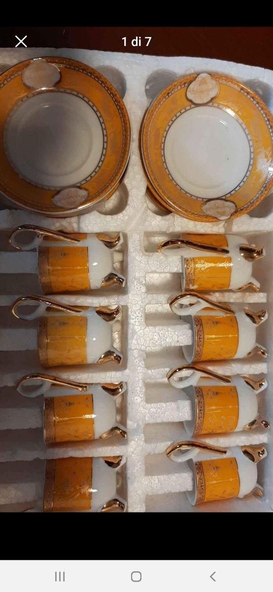 Sono 16 pezzi di porcellana ( 8 mini tazzine con 8 piattini) dipinti a mano Venezia Gold Collection con scatola originale. Particolari e bellissimi.