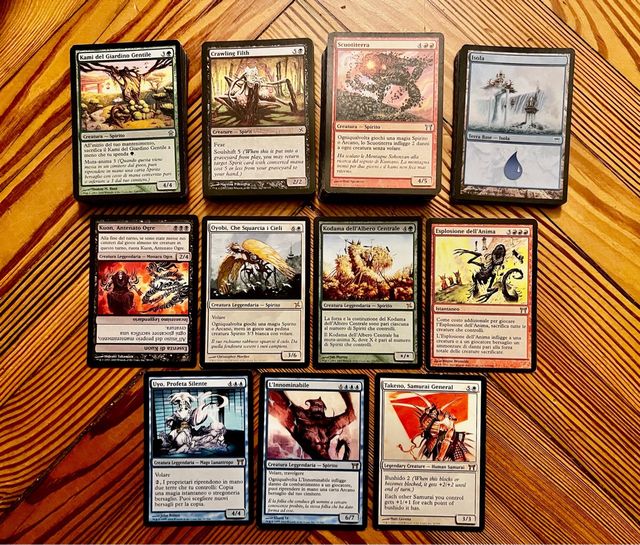 Set di 163 carte magic vintage del blocco kamigawa, tutte diverse. Presenti carte di campioni di kamigawa, traditori e liberatori di kamigawa. Le carte presenti sono quelle in foto, 7 rare, tante non comuni.