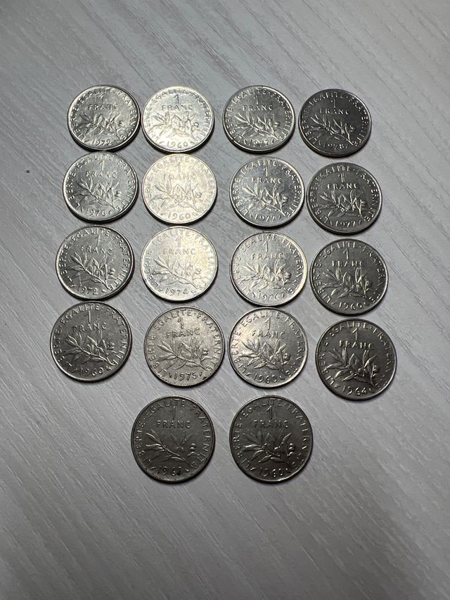 Dettagli del prodottoSet di 18 monete da 1 Franco Francese. Ogni moneta presenta un design classico con l'iscrizione Egalité, Fraternité, Liberté e una ghirlanda di alloro. - Monete da 1 Franco Francese. - Design con ghirlanda di alloro. - Iscrizione Egalité, Fraternité, Liberté. La descrizione è stata tradotta automaticamente.