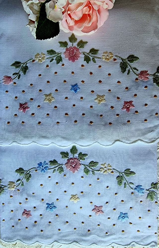 Dettagli del prodotto2 grandi asciugamani anni 50 in puro lino con deliziosi ricami a punto pieno, smerli e orlo a giorno fatti interamente a mano.