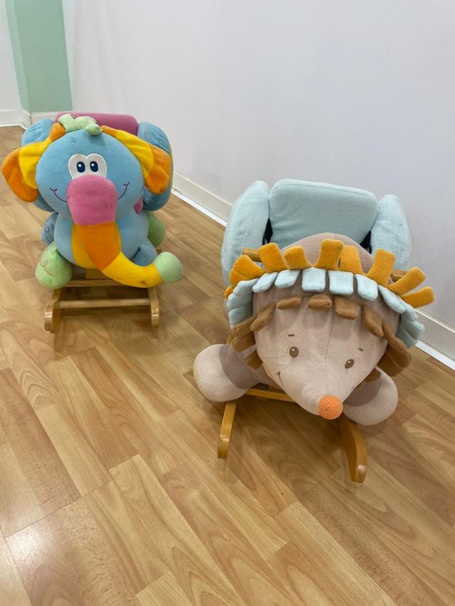 Dettagli del prodottoVengono vendute due sedie a dondolo in legno per bambini, una a forma di elefante e l'altra a forma di riccio. Entrambi sono in buone condizioni e sono ideali per far divertire i più piccoli di casa.