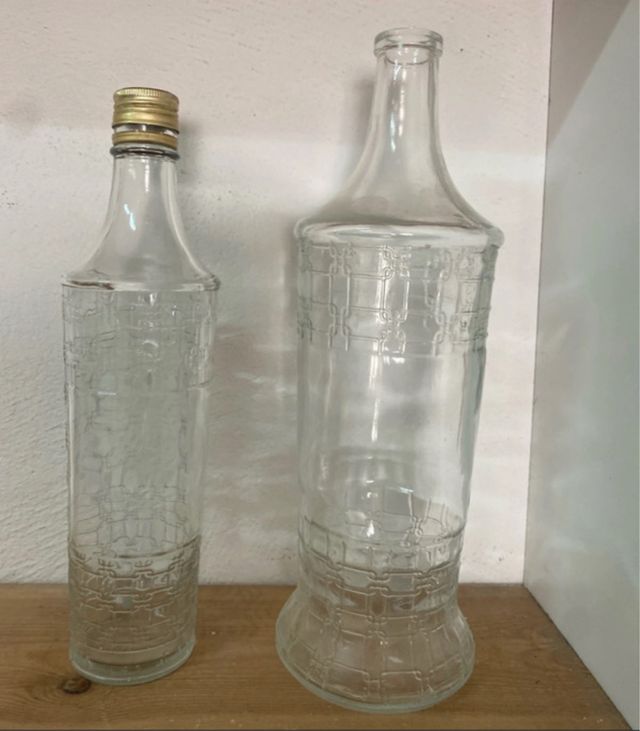 Dettagli del prodottoSet di due vecchie bottiglie di Anis La Cadena. Perfette per collezionisti o come elementi decorativi. - Bottiglie in vetro trasparente. - Design con catena in rilievo. - Una bottiglia con tappo metallico. La descrizione è stata tradotta automaticamente.