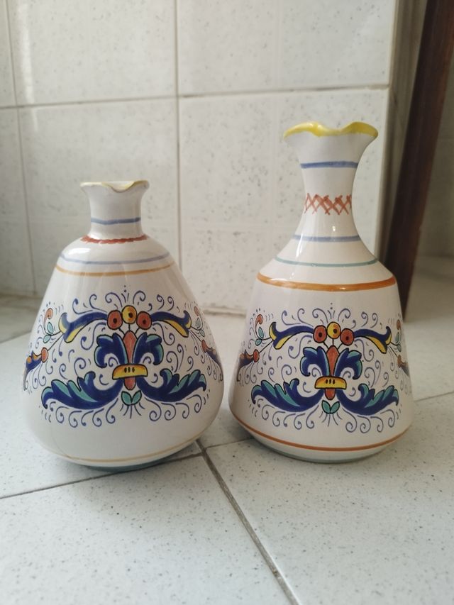 Dettagli del prodottoSet di due caraffe in ceramica di Deruta, decorate a mano con motivi floreali.